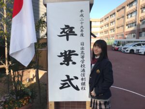 この画像は加工されていますが、卒業式の看板や背景の建物は日出高校のものです。
